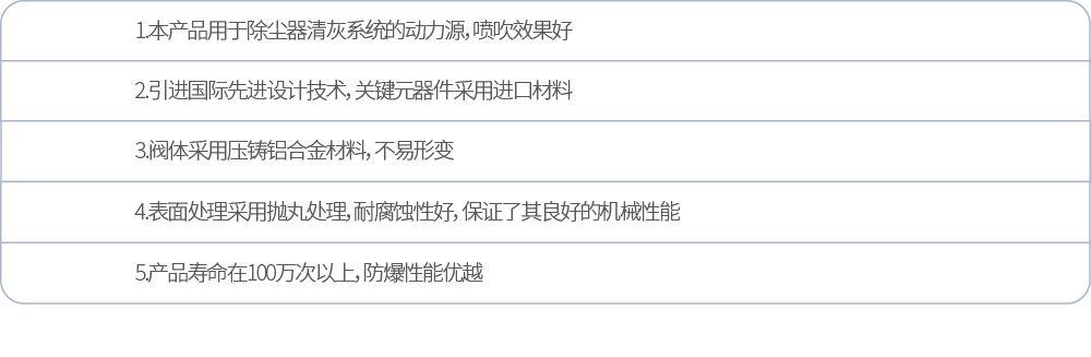 RMF-Z-15M-EX(防爆) | Φ15mm | G1/2" | 0.3~0.8MPa | -5℃~+55℃ | <85% | 清洁空气 | AC1100V/ AC220V/ DC24V | 喷吹100万次以上 |