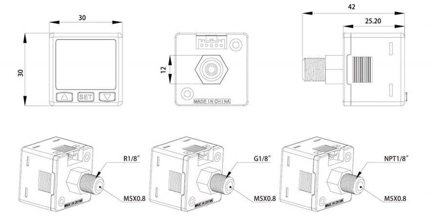 压力接口 | 外螺纹R1/8、G1/8、NPT1/8,内螺纹M5 | ||